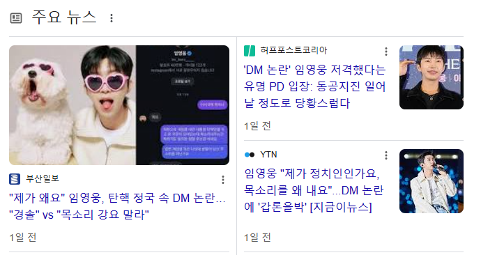 어제 뉴스에 가수 임영웅이 탄핵결의로 온 국민의 이목이 쏠린 상황에서 자신의 반려견과 익살스런 사진을 올렸고, 이것에 열받은 한 사람이 이런 상황에서 적절치 못하다는 DM을 보내자, 자기가 왜 그런것에 신경써야하며, 자신은 정치적인 이야기를 하지 않는다는 말에, 다수의 국민의 감정을 건드린 사건이 있었습니다.